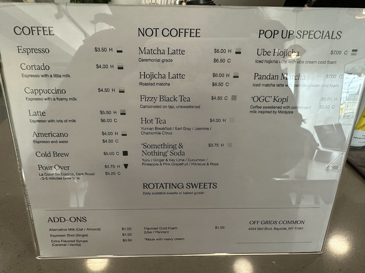 Welcome to Off Grids Common, a cozy and inviting café nestled in the heart of Bayside, NY. This hidden gem is redefining the café experience with its delicious offerings and laid-back atmosphere. The menu celebrates both traditional and innovative beverages, featuring a delightful array of teas like Hojicha and Matcha lattes, as well as a range of refreshing bottle drinks from Something & Nothing, including Yuzu and Ginger & Key Lime.